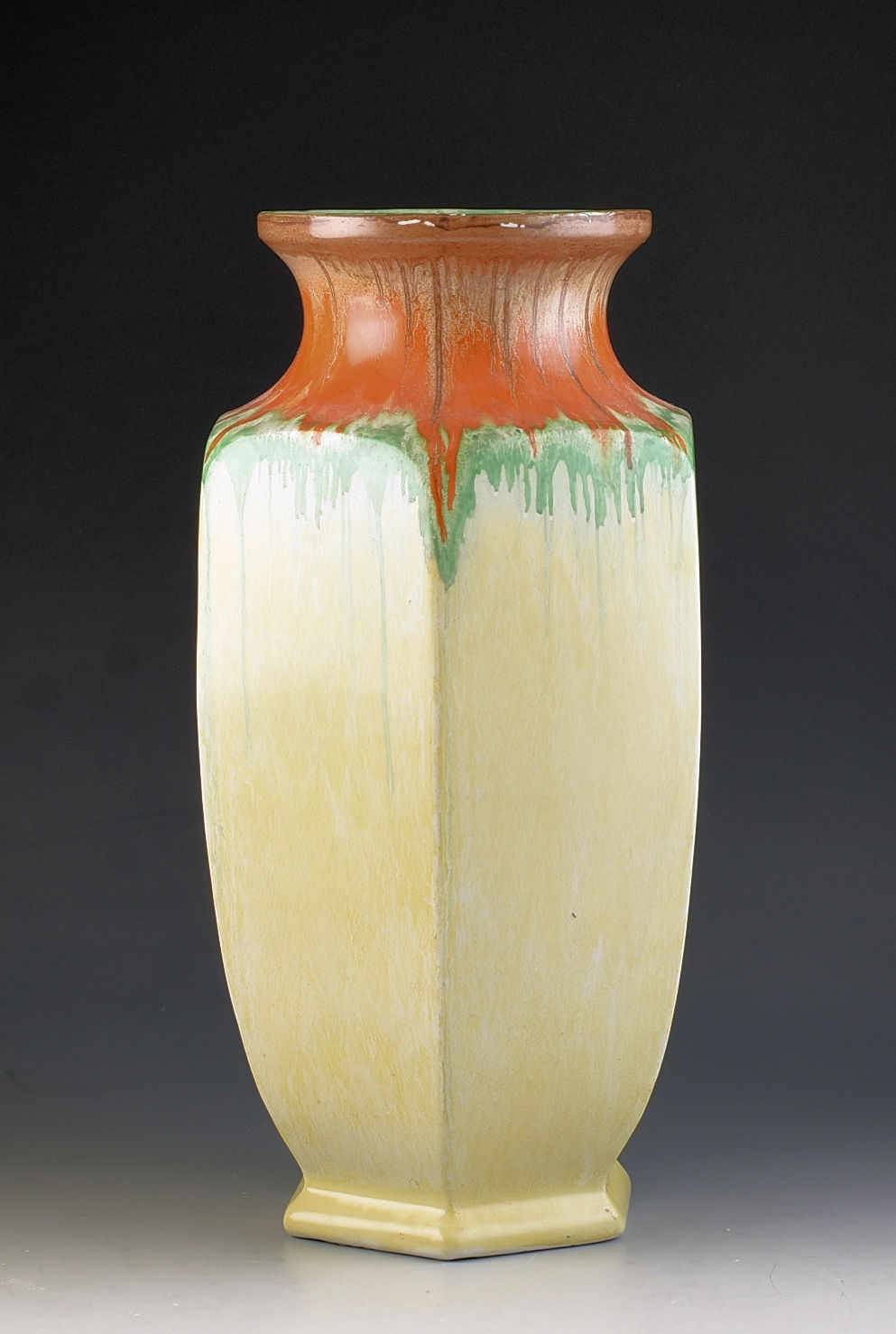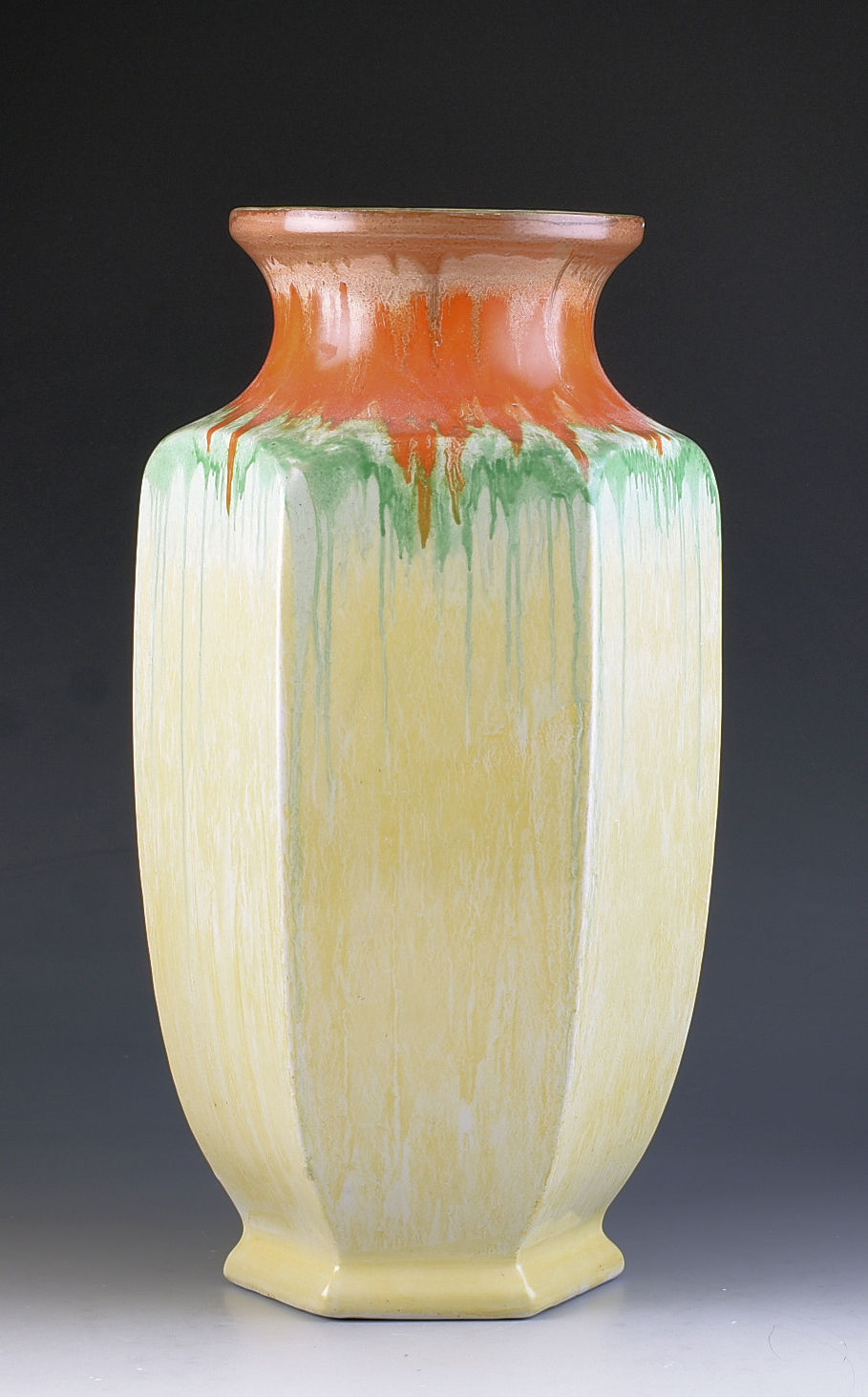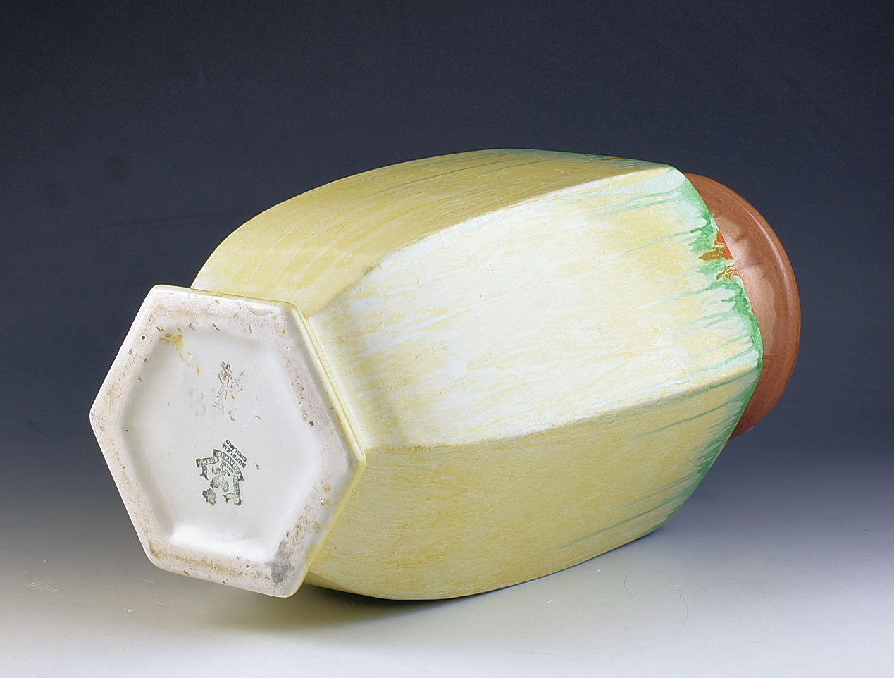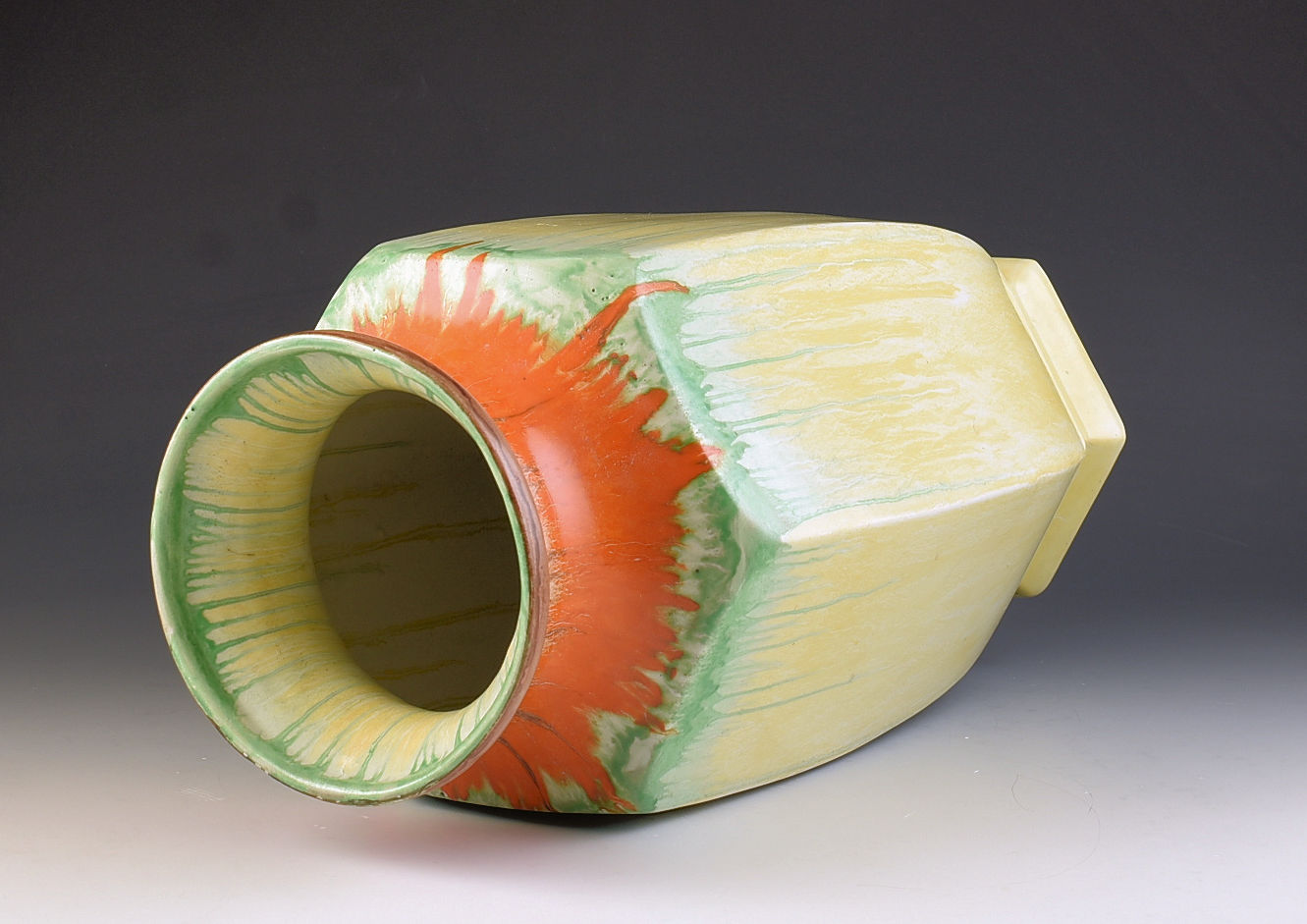 This is a really rare vase, a large early shape (37) that has clearly stayed in a storeroom somewhere as this vase carries a 1935 backstamp with a 1931-32 pattern applied, also it could have been decorated early on, left on a shelf in the warehouse and backstamped when sold, an anomaly for sure. Strongly decorated in Delecia colours and measuring a large 15" in height and is 7" wide. GUARANTEED to be free from damage or restoration and has an early wilkinson mark to the base as well as a Clarice cliff backstamp. A very large impressive vase.