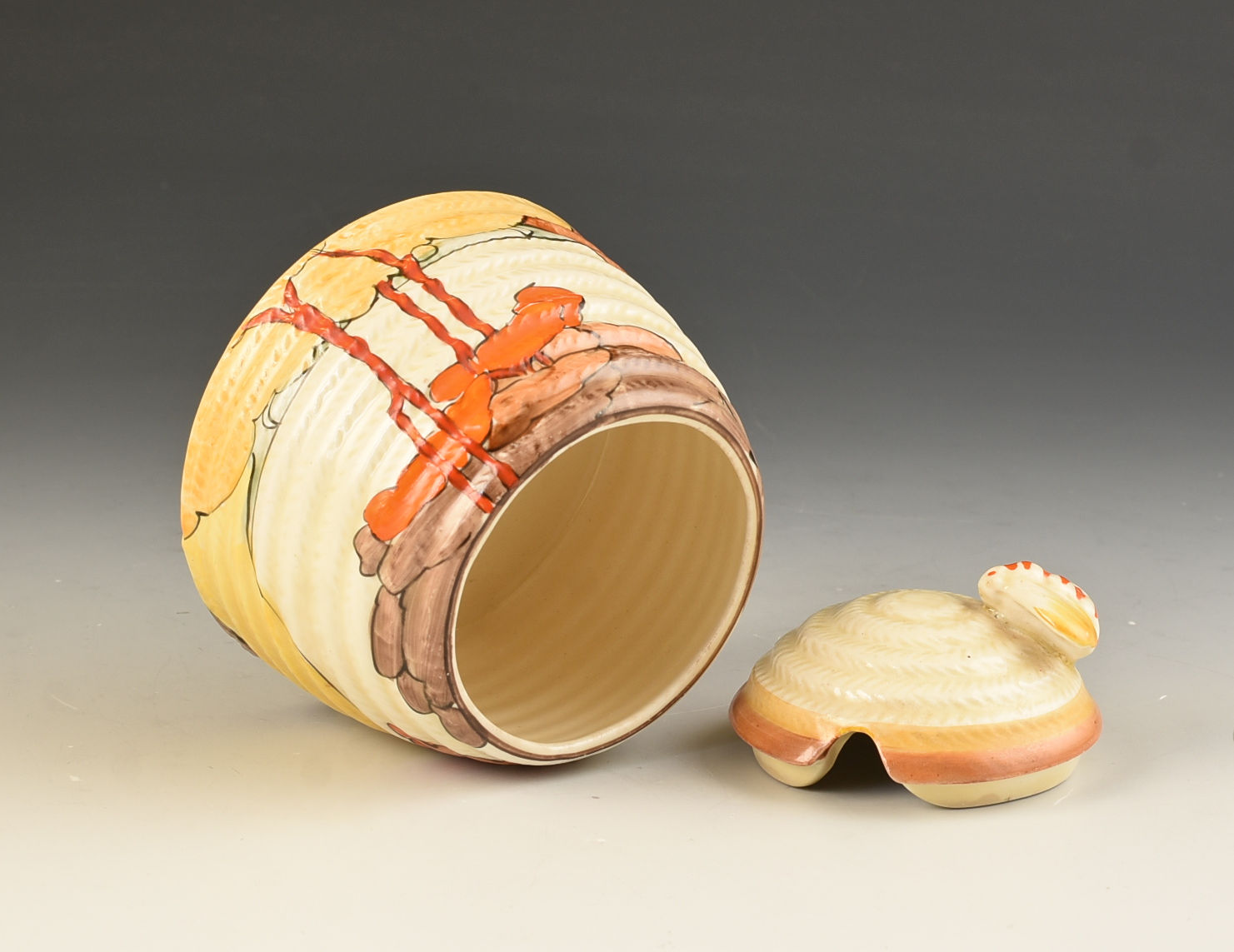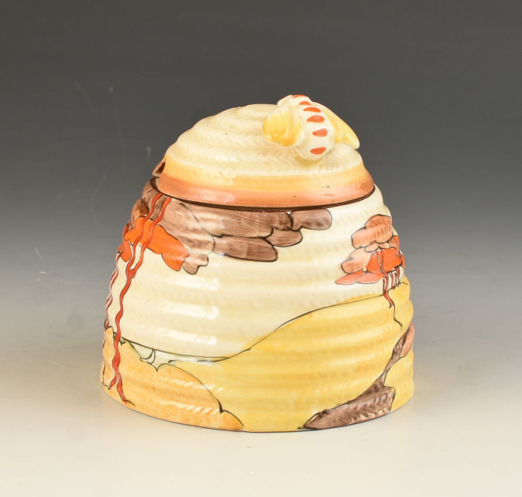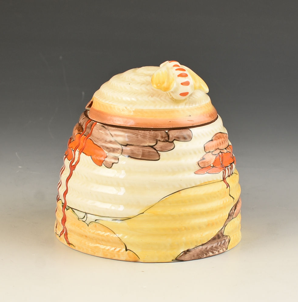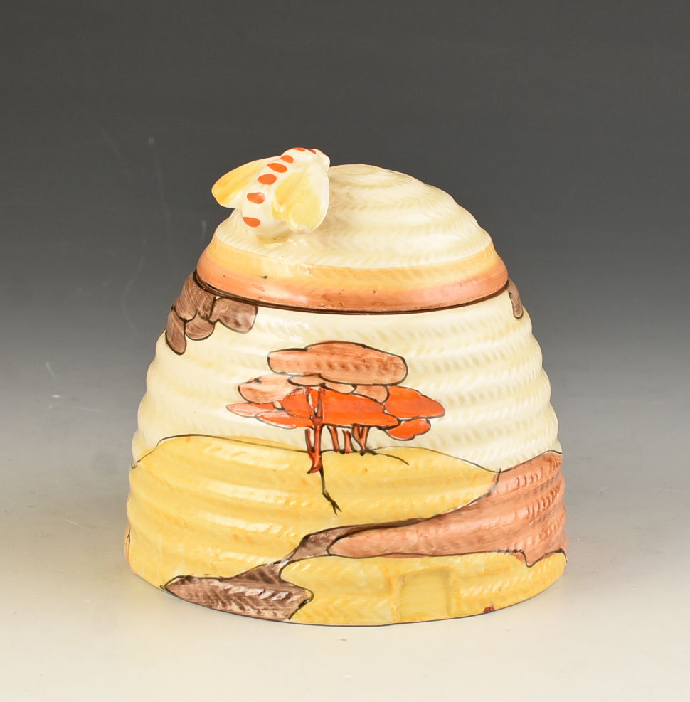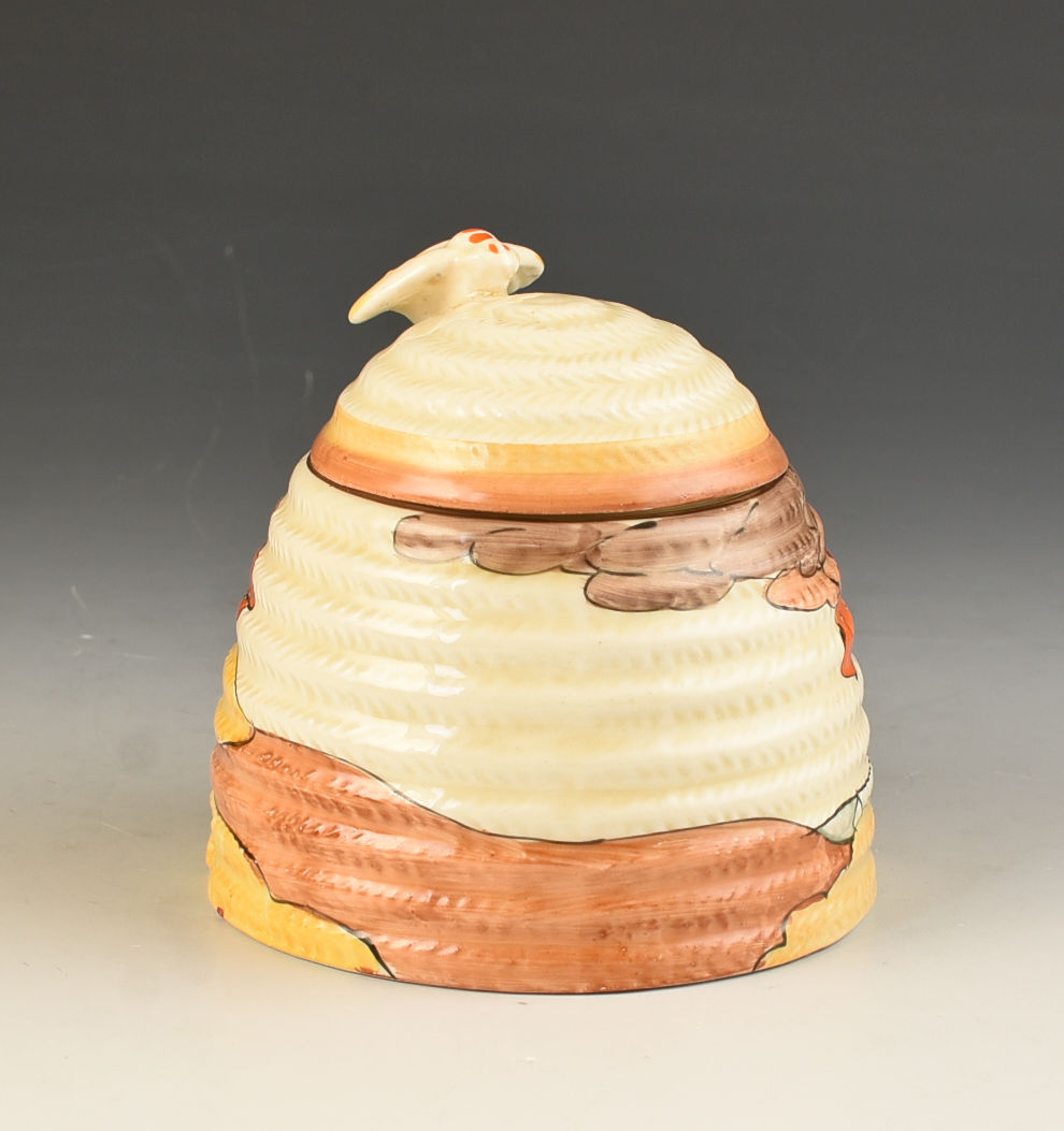 A very nicely decorated Coral Firs large size beehive honeypot that will date to 1934. A full version of the pattern in bold colours. It has it's correct original lid and i can GUARANTEE to be free from damage or restoration. It measures 9cm in height and is fully signed to the base.