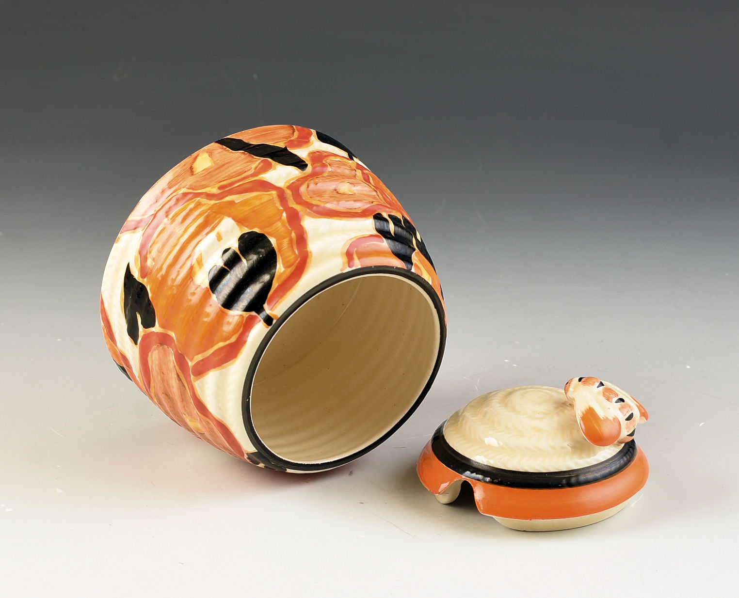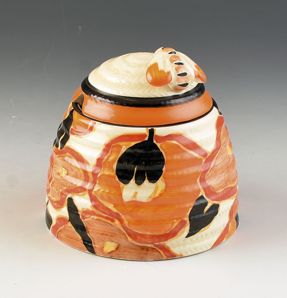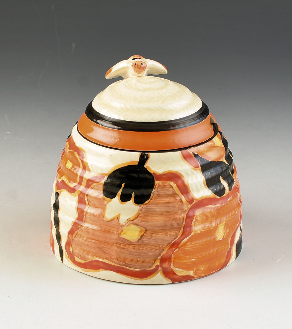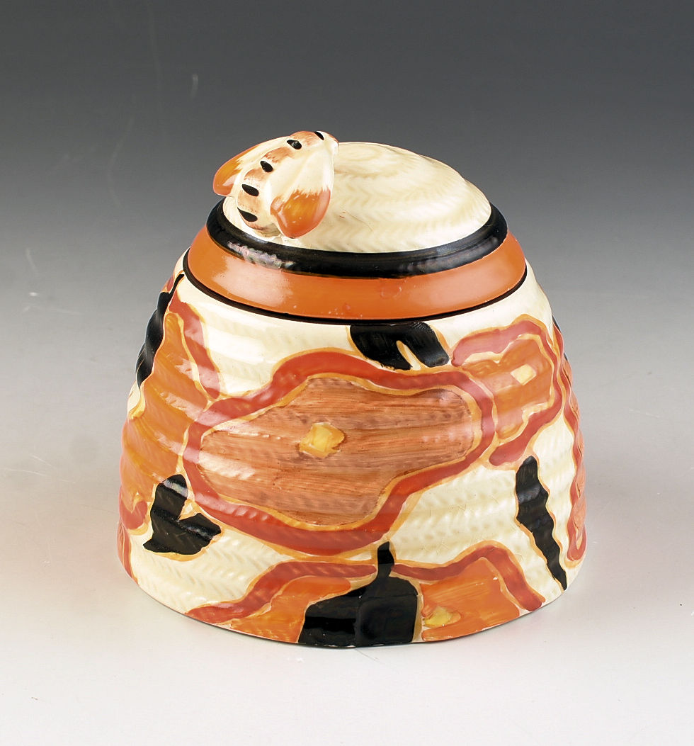 A rare and beautifully decorated large size honeypot in Orange chintz. This will date to 1933 and is a bold, clean example with it's correct original lid. There are a couple of tiny minute marks on the edge of the lid that you might not even see, otherwise i can GUARANTEE to be free from damage or restoration. It measures 4" or 10cm in height and is fully signed to the base.