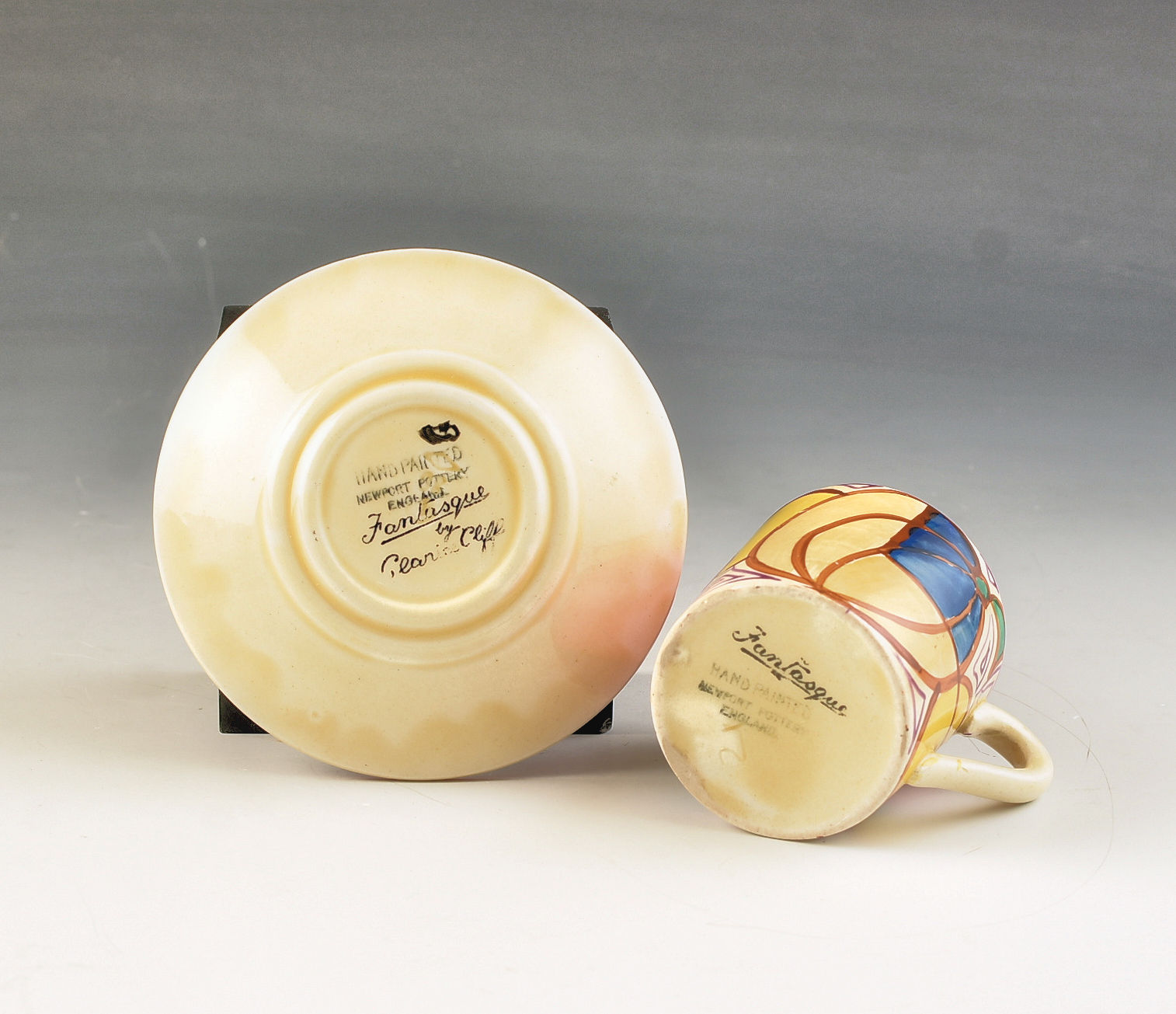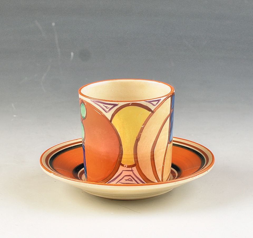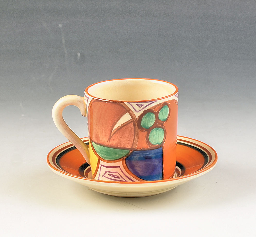 An unusual and really nicely decorated tankard shape coffee can and saucer in Orange Melon dating to 1930. This piece shows a full version of the pattern and has its correct original saucer. GUARANTEED to be free from damage or restoration the can measures 2.25" or 5.5cm in height and the saucer is 4" or 10cm wide. Both are signed to the base.