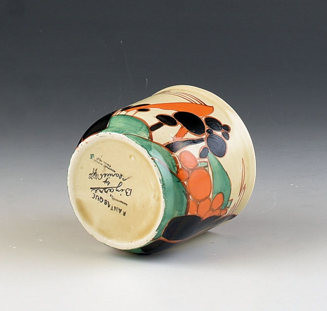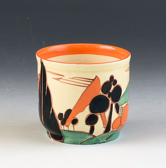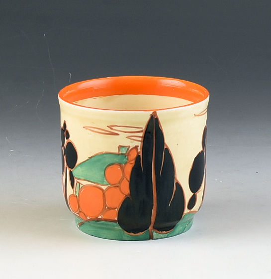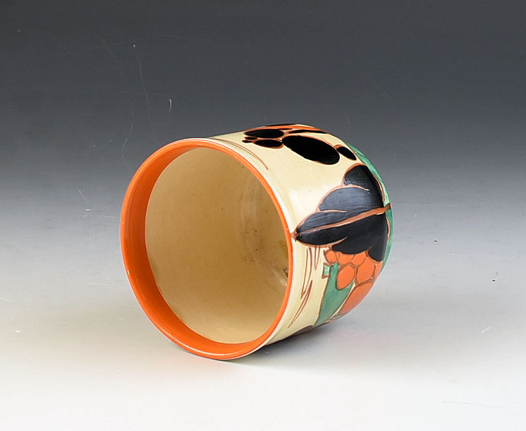A really boldly painted fern pot in the Orange colourway of Trees & House. A full repeating version of the pattern in strong, crisp colours. GUARANTEED to be free from damage or restoration it measures 7cm by 7.5cm and is fully signed to the base.
