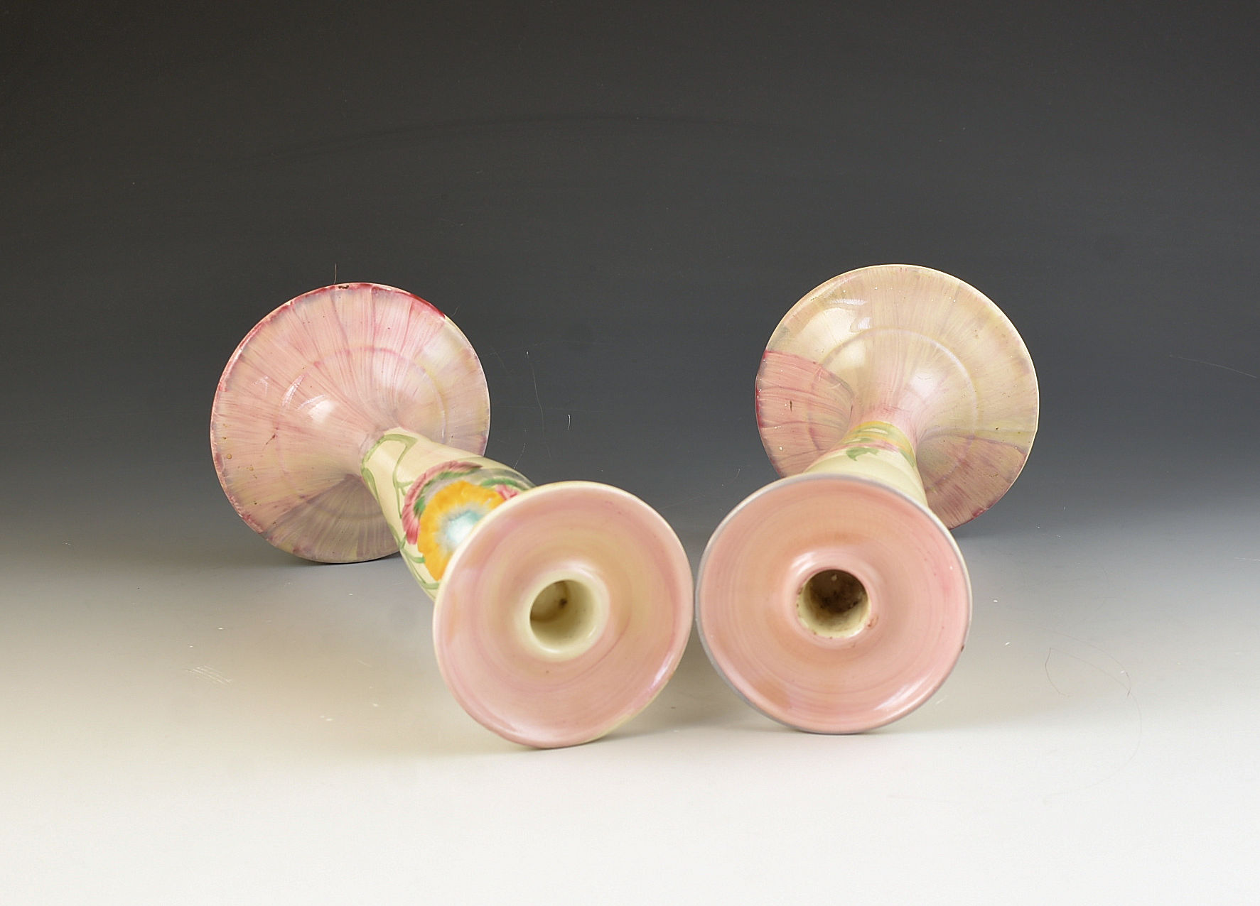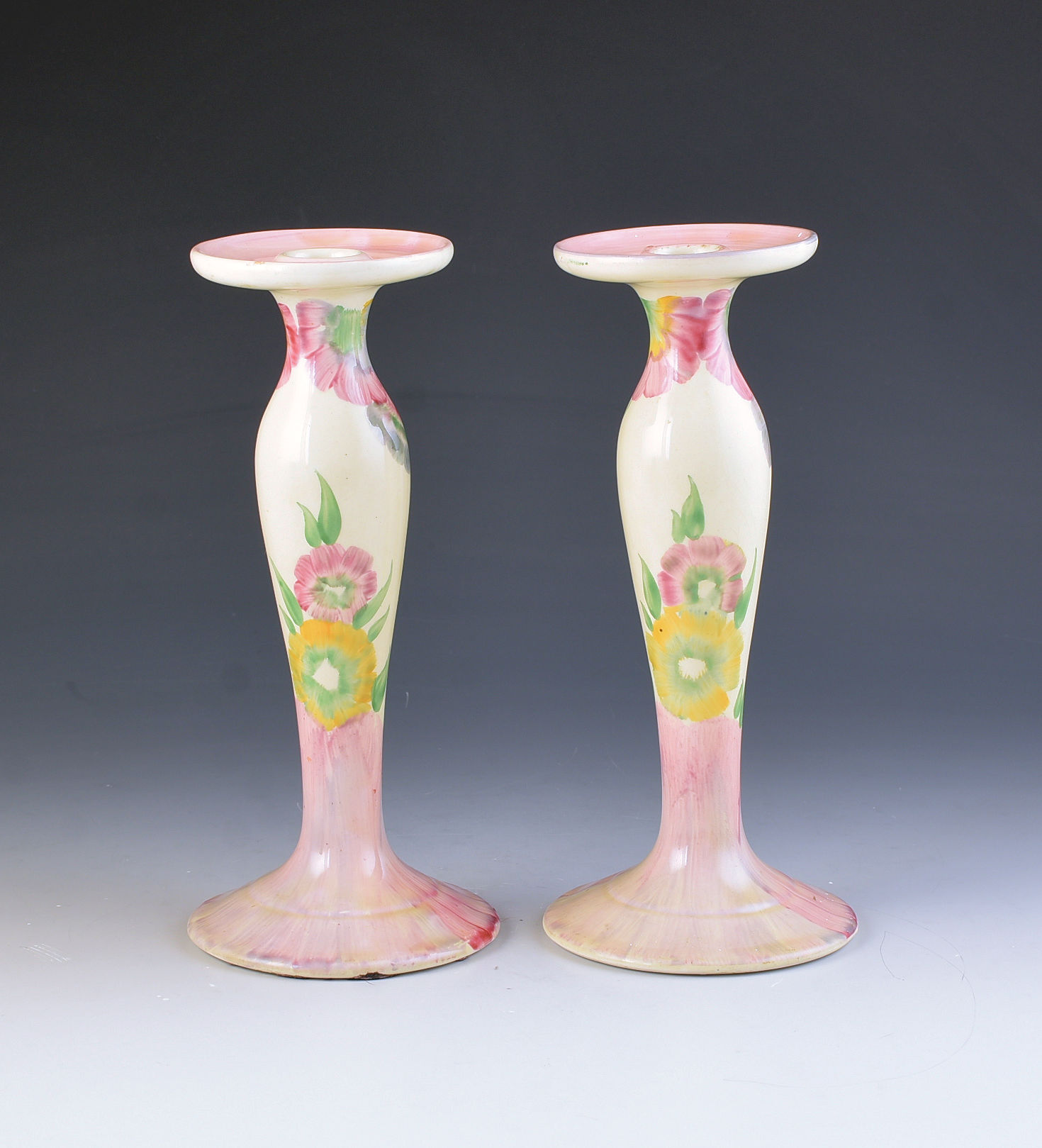 A beautiful pair of Pink Pearls candlesticks that will date to 1935. A very rare shape of which the number escapes me but usually found on earlier patterns. They show a full version of the pattern, measure 22cm in height and i can GUARANTEE to be free from damage or restoration. Both are fully signed to the base.