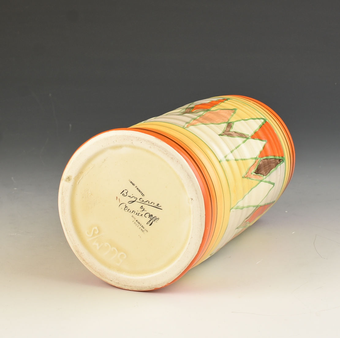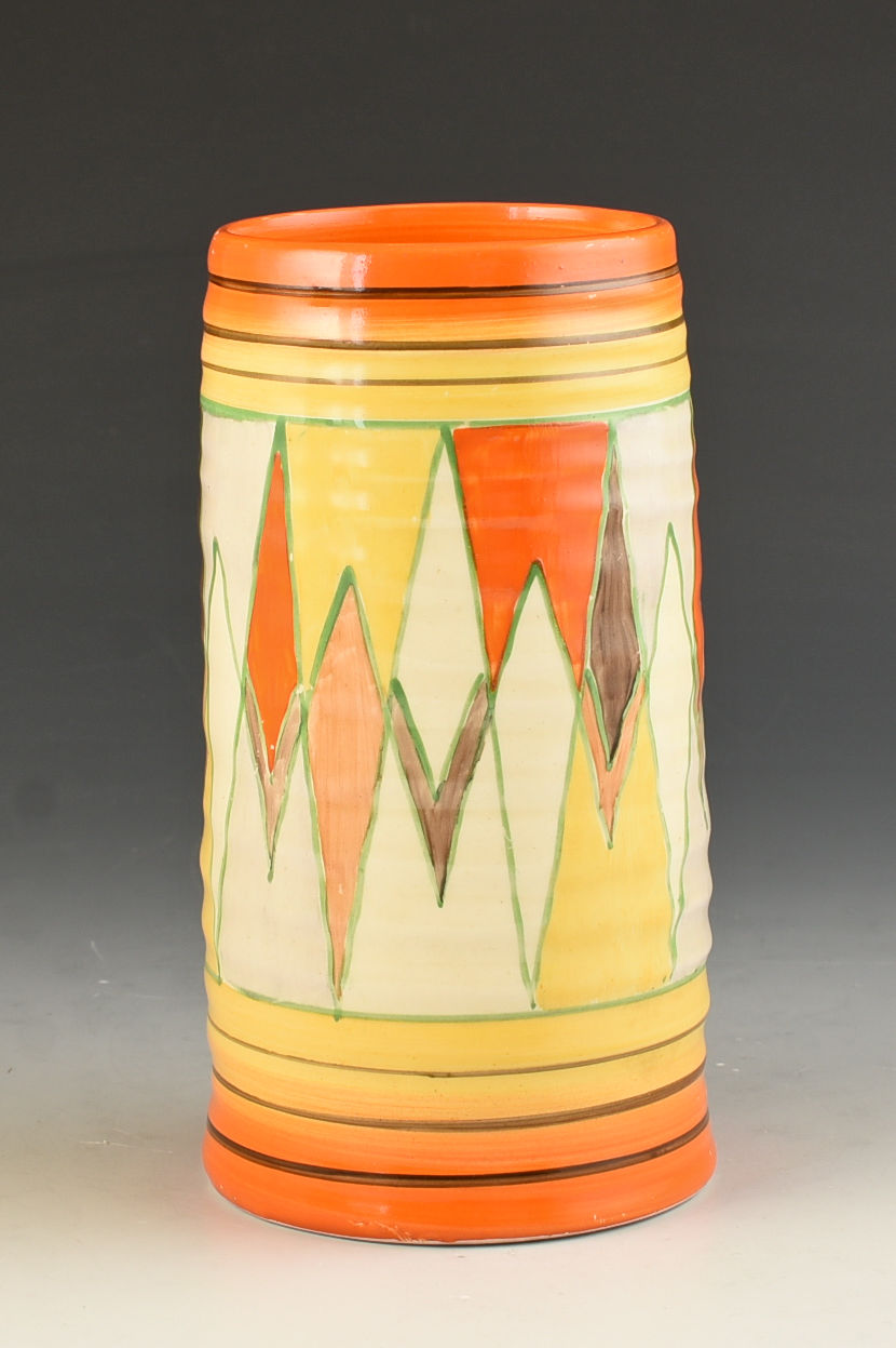 A really strong 566 vase decorated in the Abstract design, Sungold. This is a 1934 design and works perfectly on the shape. GUARANTEED to be free from damage or restoration it measures 6.25" or 16cm in height and is fully signed to the base.