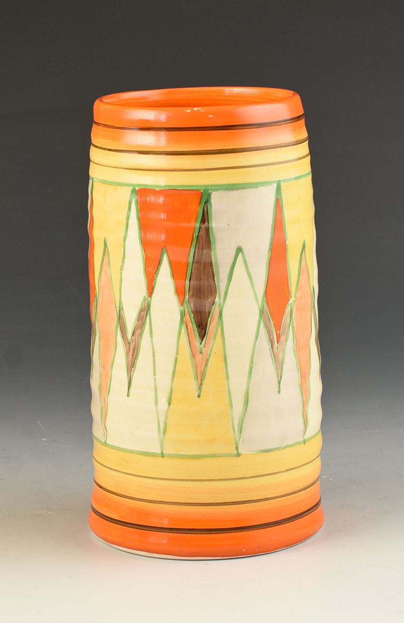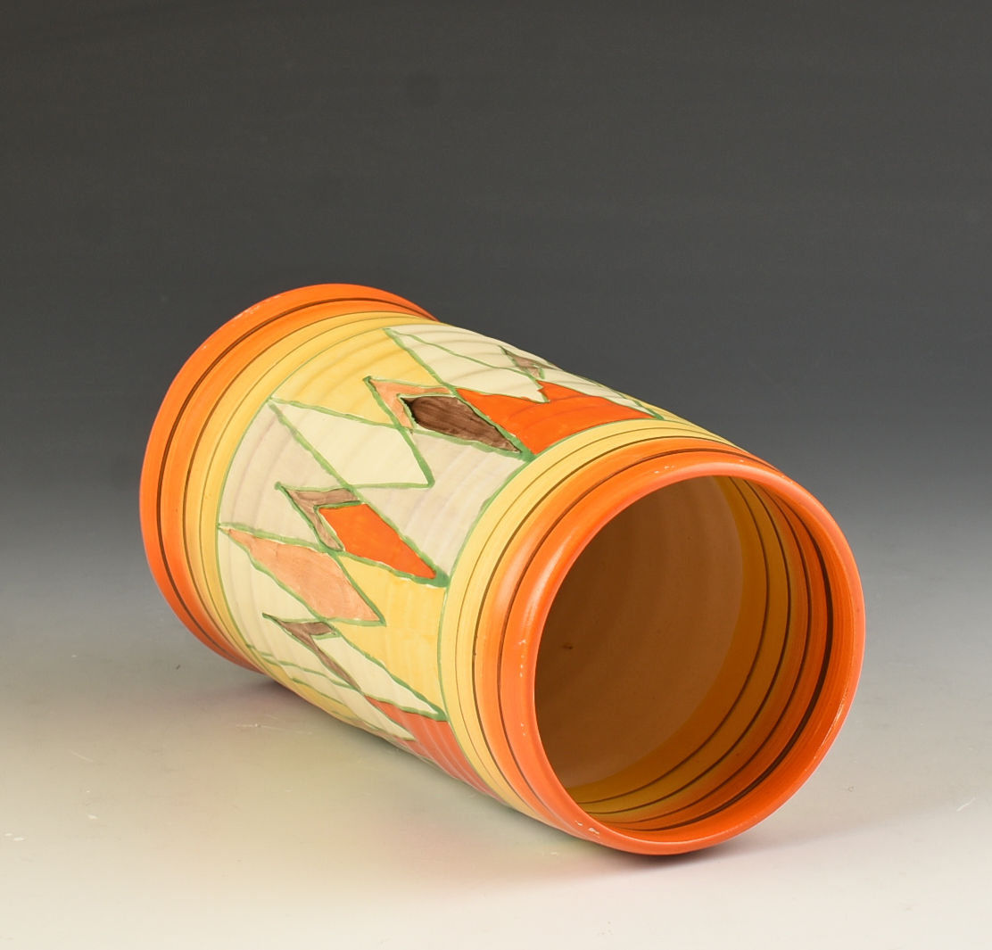 A boldly decorated 566 shape vase in Sungold, an Abstract design that dates to 1934. Strong colours and GUARANTEED to be free from damage or restoration. It measures 6.25" or 16cm in height and is fully signed to the base.