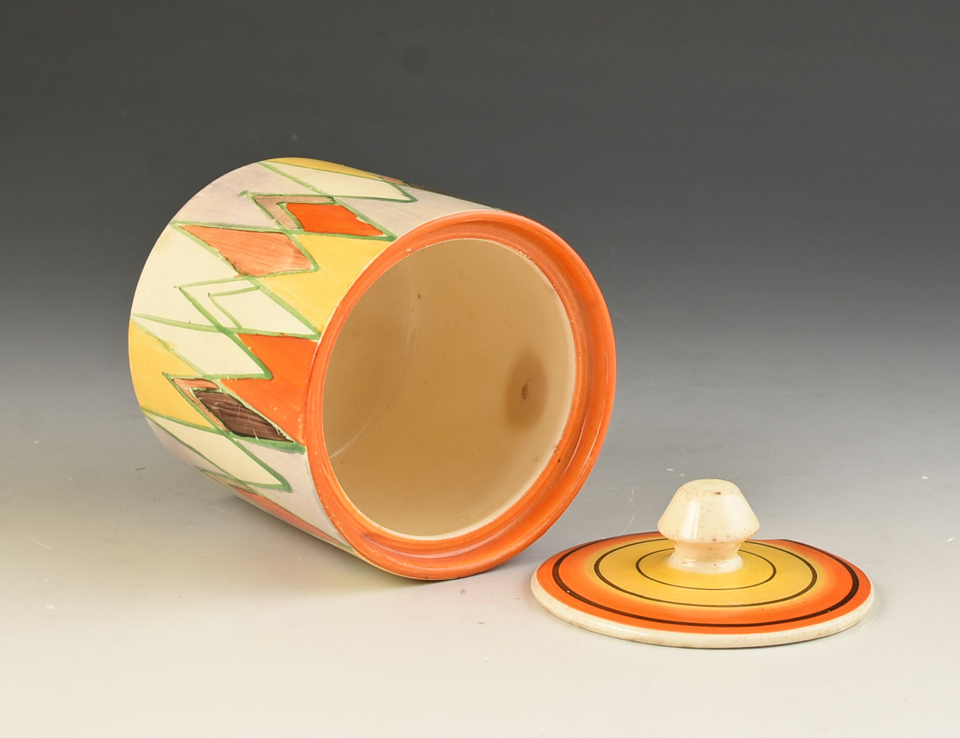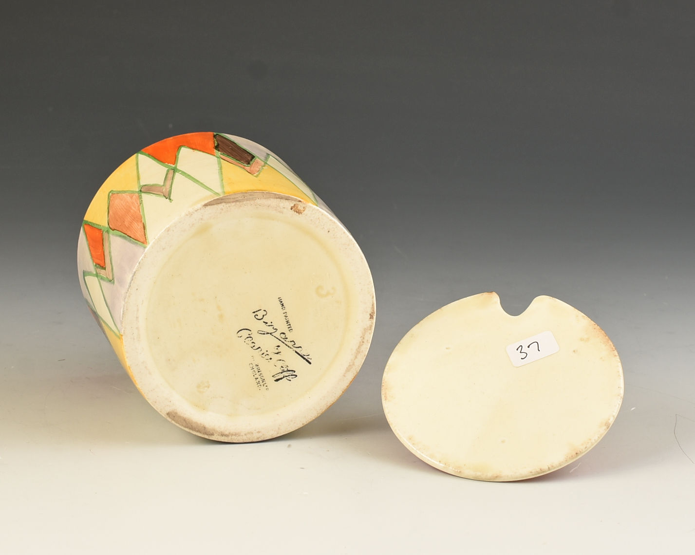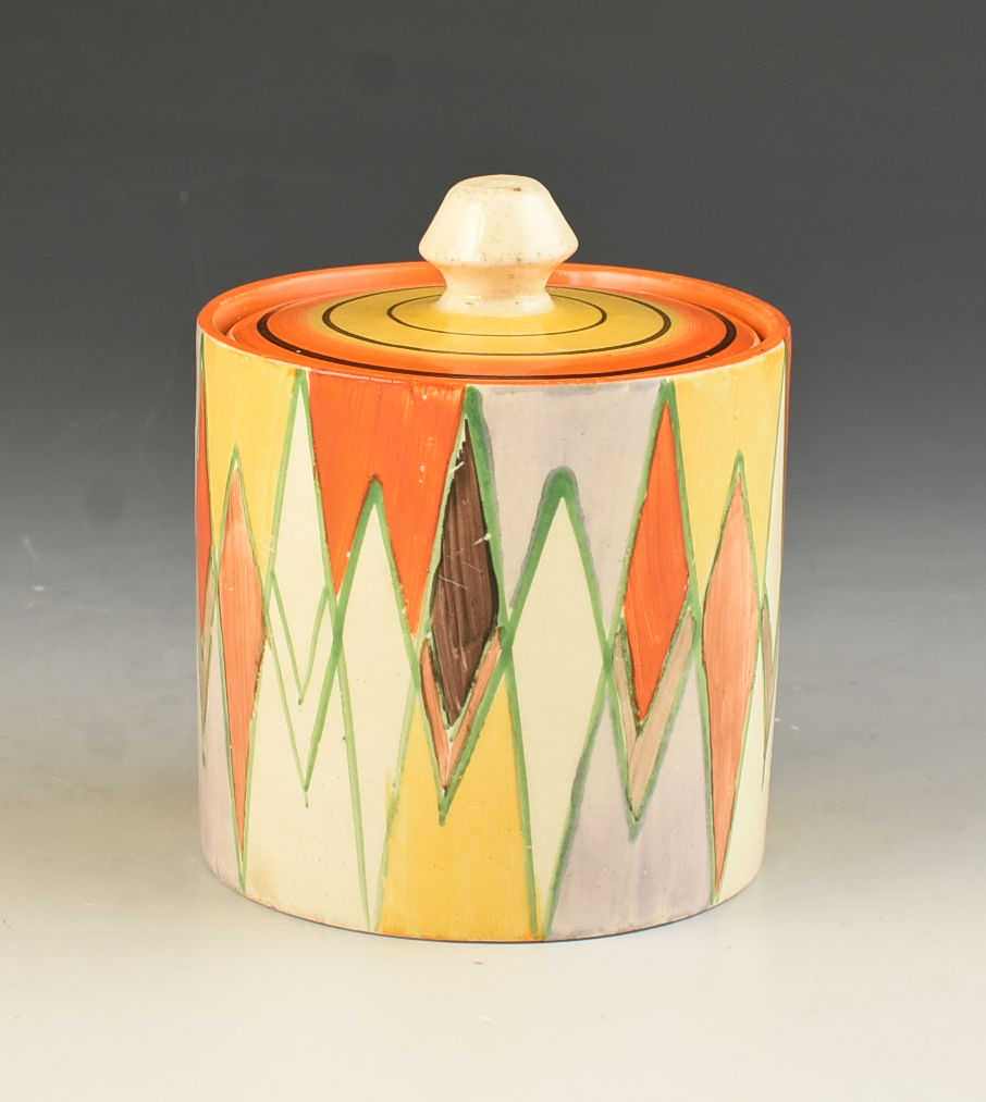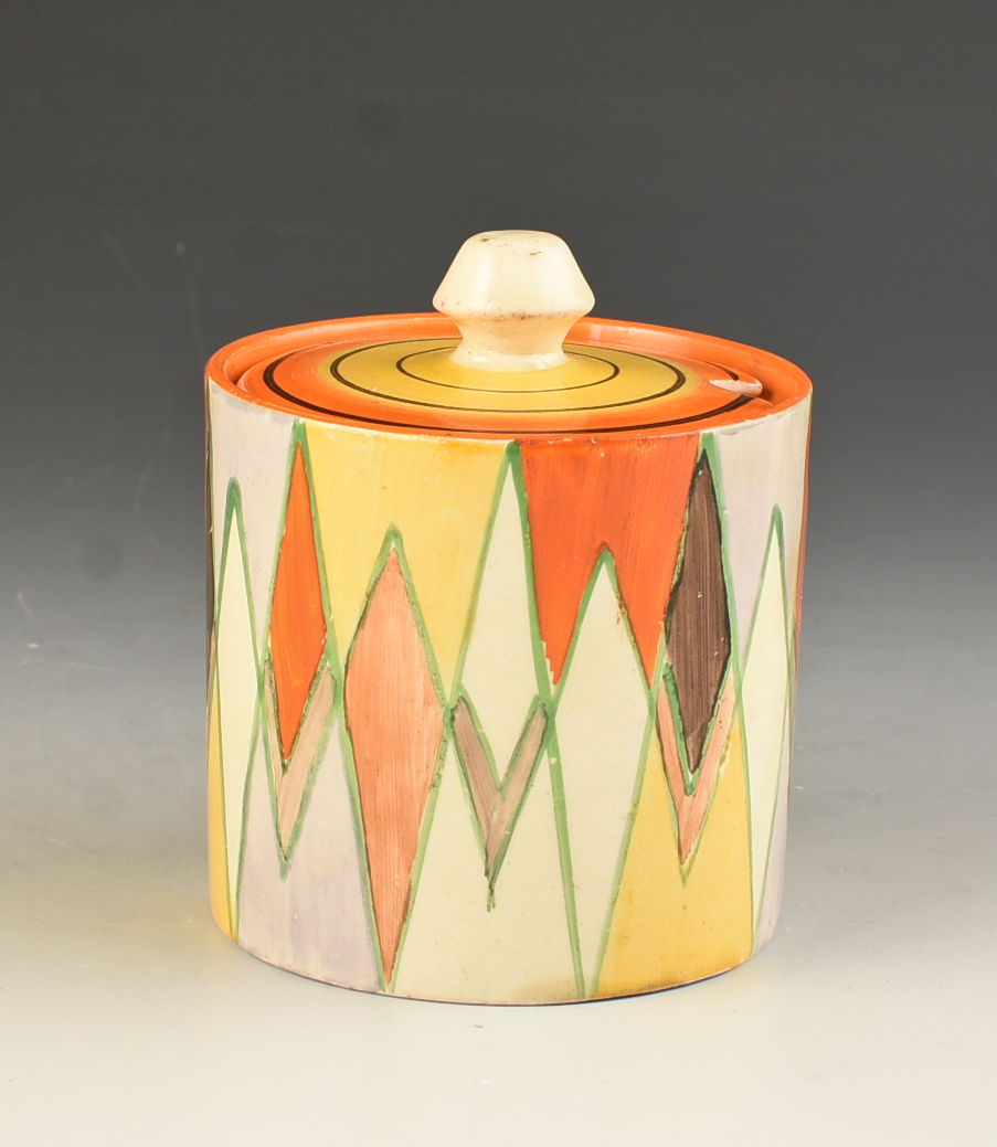 A rare and boldly decorated drum shape jampot in Sungold. This will date to 1934 and was the last of the Abstract designs produced. The jampot has a couple of small scratches and a small stain inside but is free from damage or restoration and has it's correct original lid. It measures 3.5" or 9cm in height and is fully signed to the base.