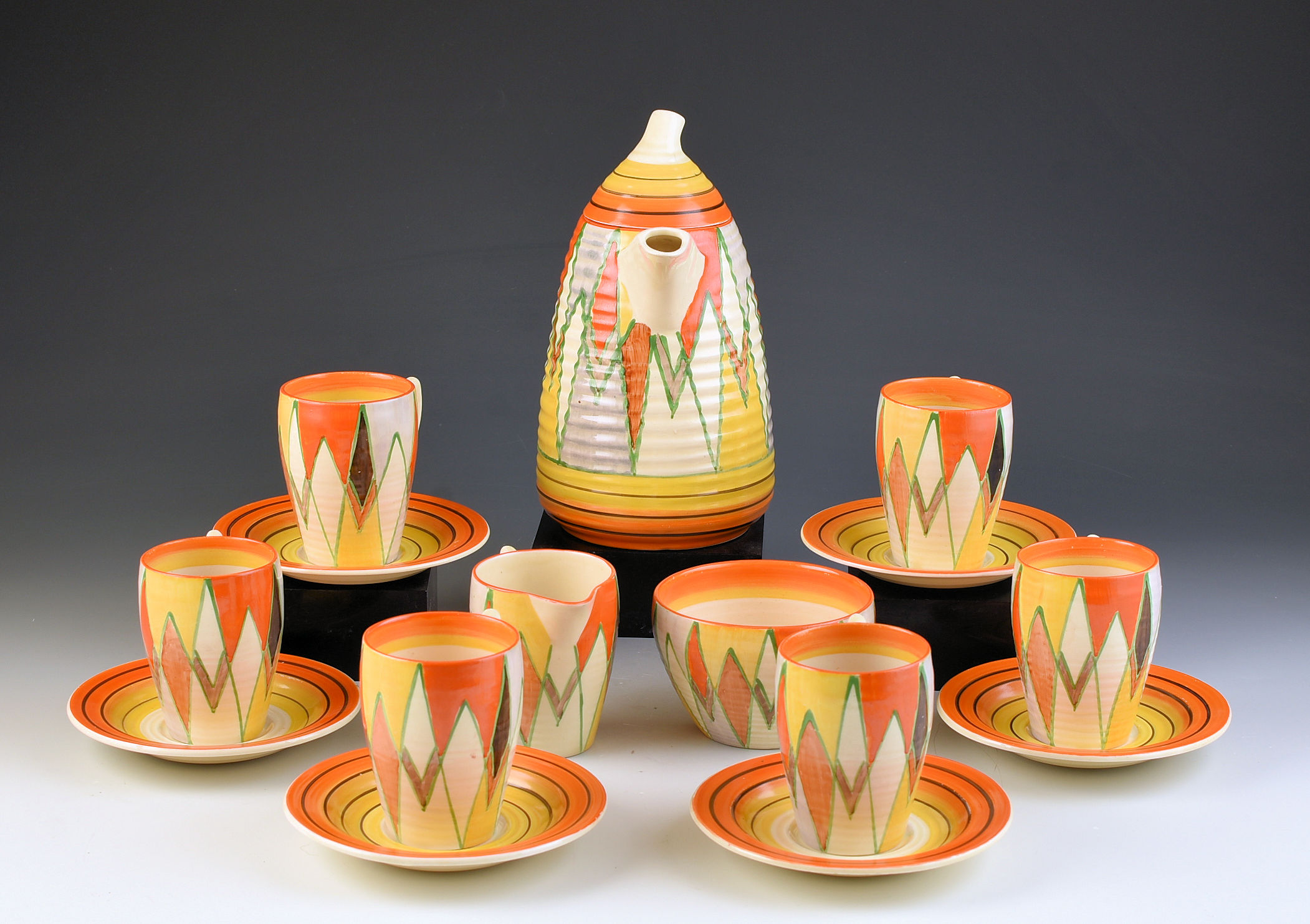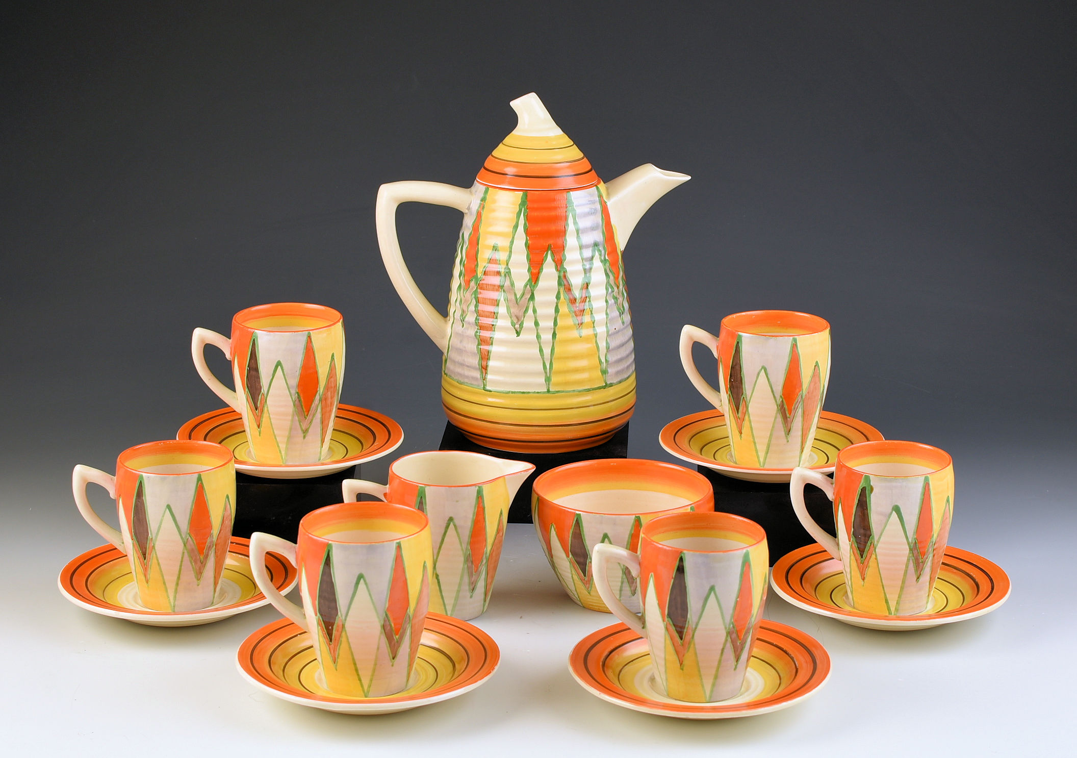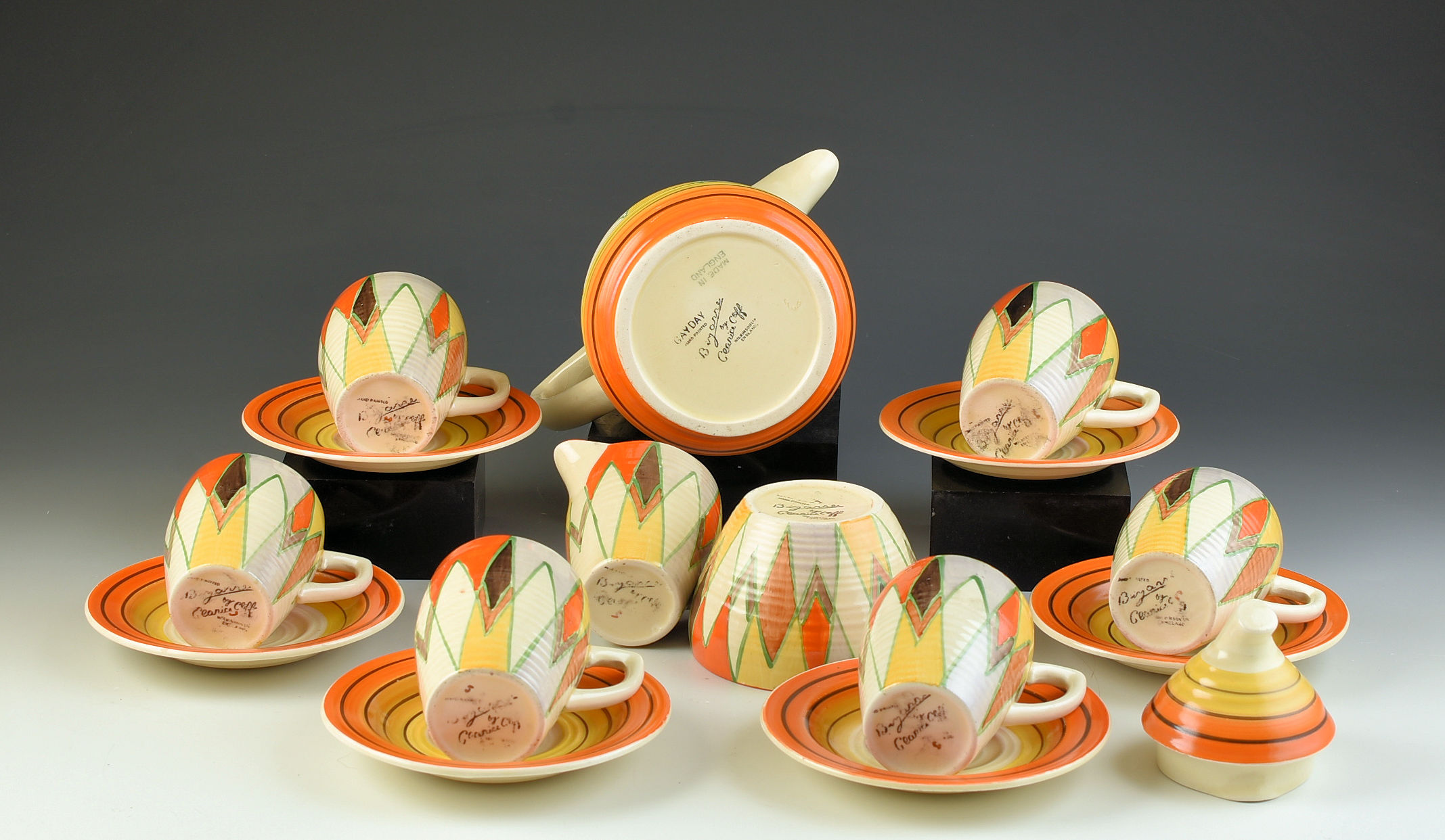 A very rare abstract Lynton shaped coffee set decorated in the Sungold design dating to 1934, this and Killarney were the last 2 abstract design issued. Superbly decorated and a very bright, bold set. I can GUARANTEE all pieces to be free from any form of damage or restoration with the pot measuring 7.5" in height and the coffee cans 3". All pieces are signed to the base.