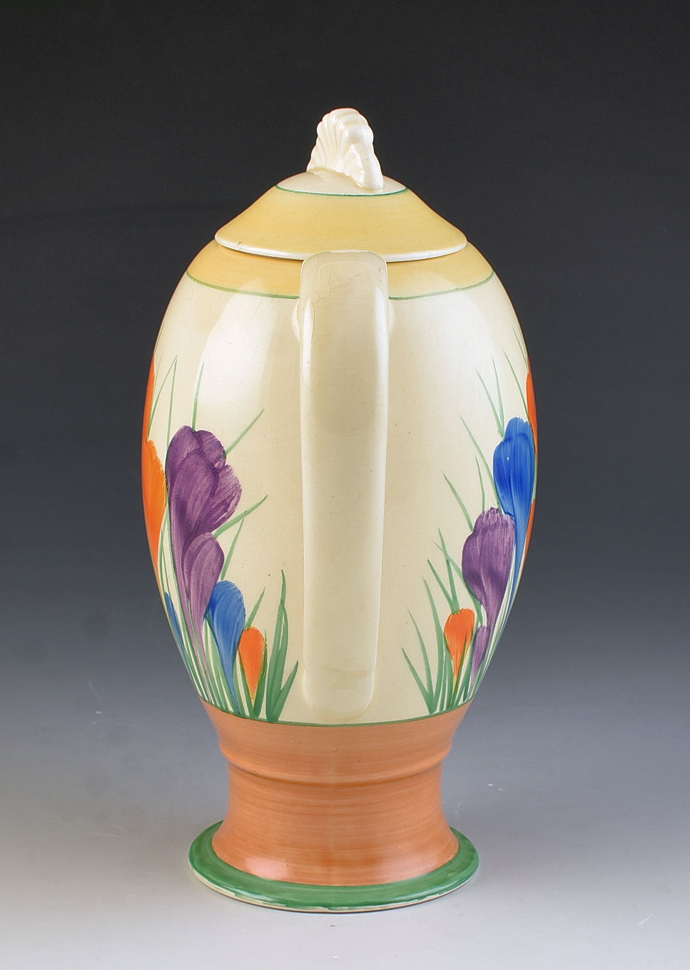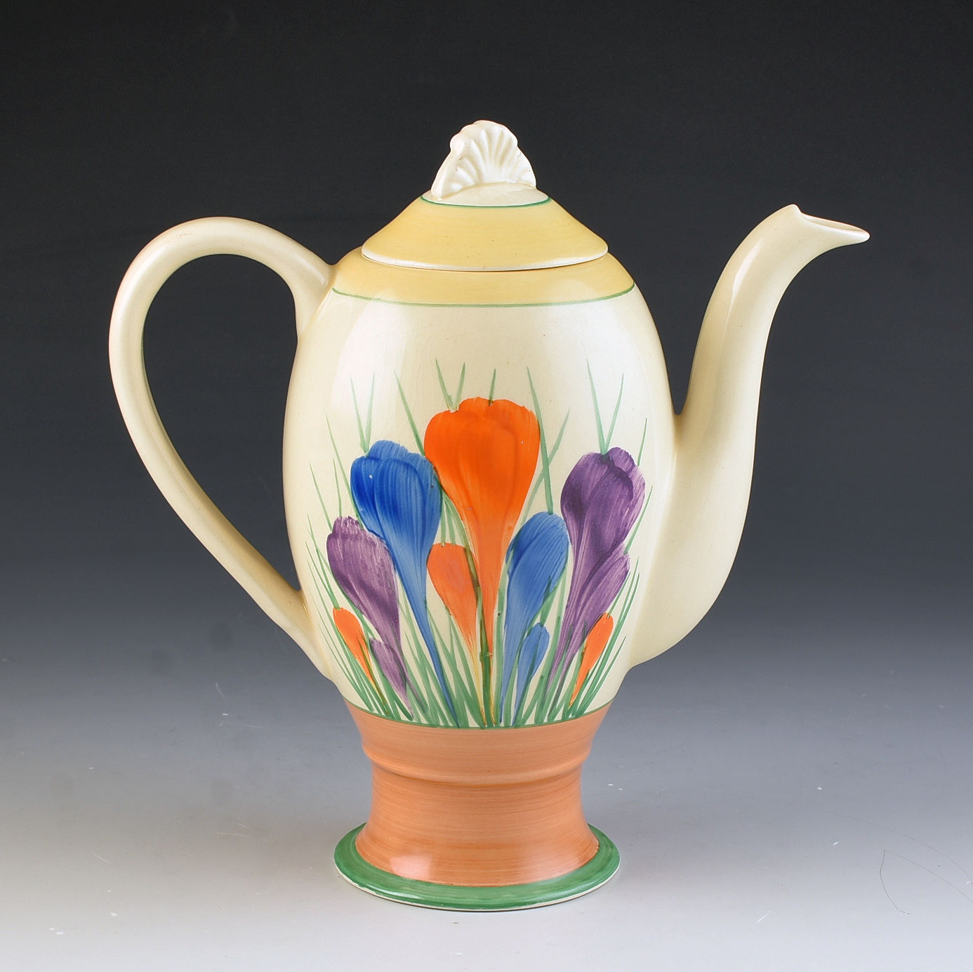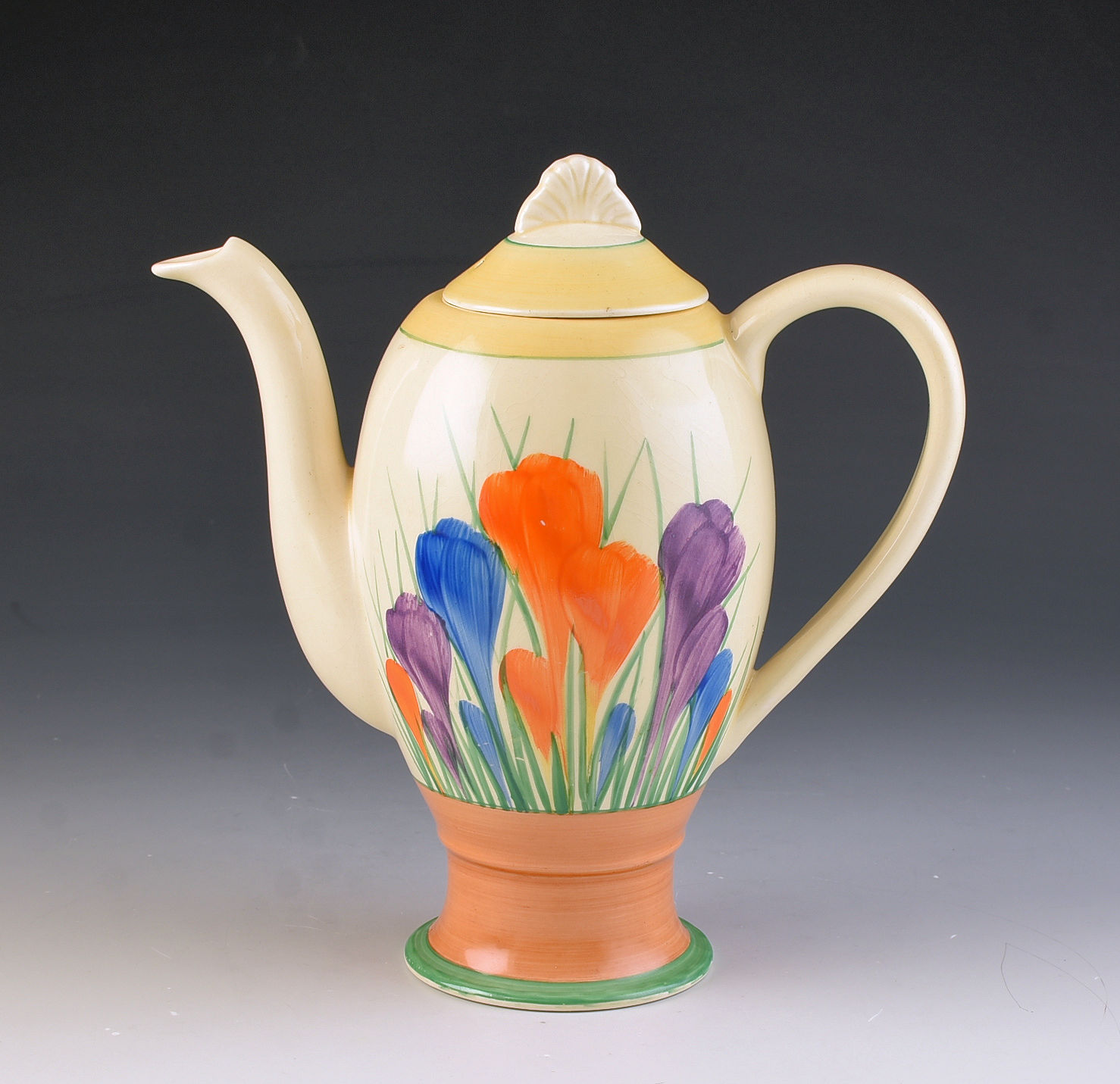 A rare shape coffee pot beautifully decorated in Crocus. This will date to around 1936 and is part of the Windsor shape range. Huge bunchy crocus, flawless condition and i can GUARANTEE no damage or restoration. It measures 8" in height, is 8" wide and fully signed to the base.
