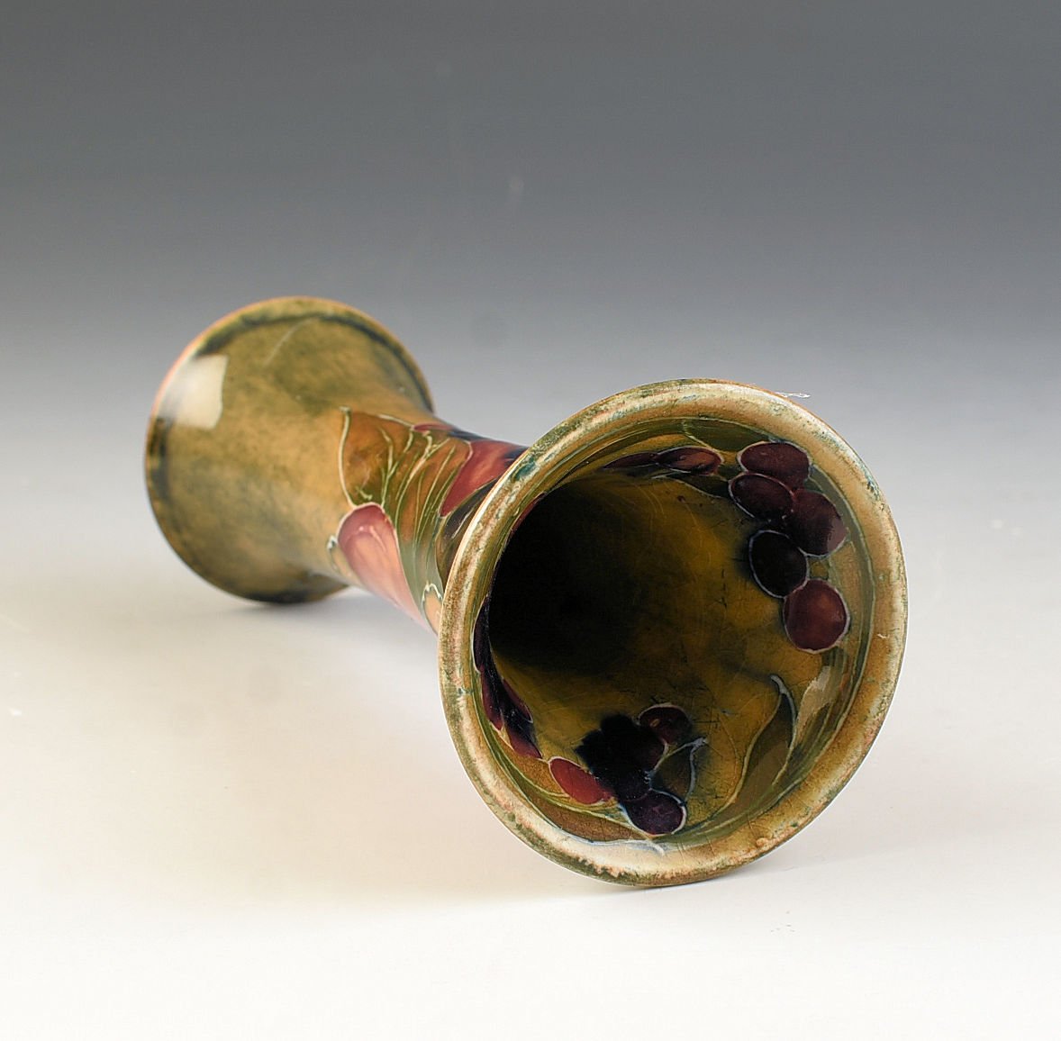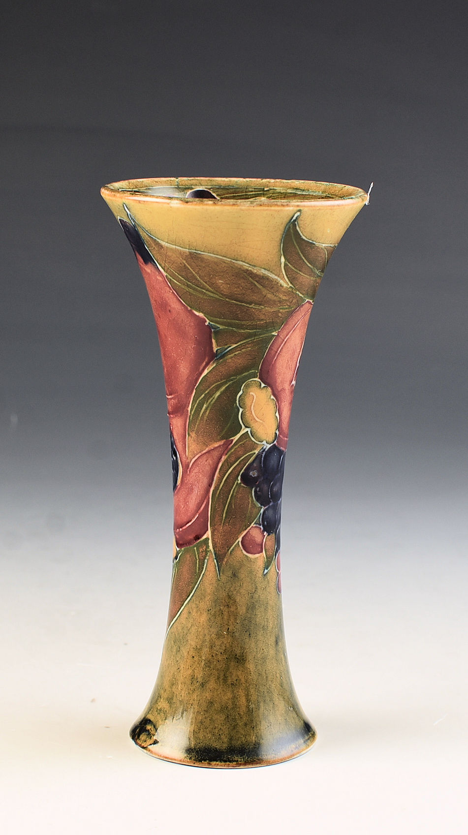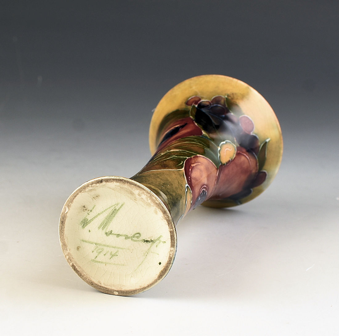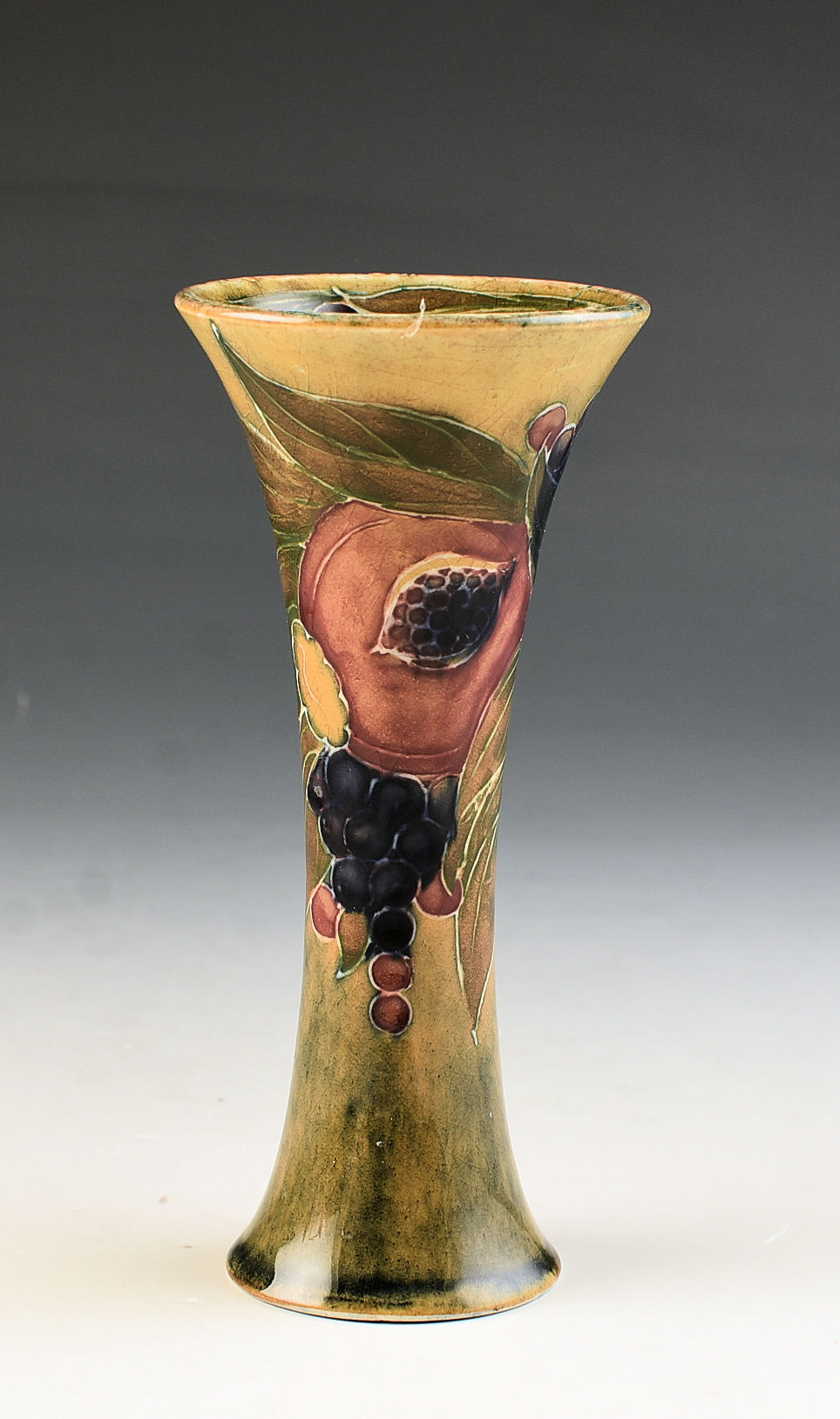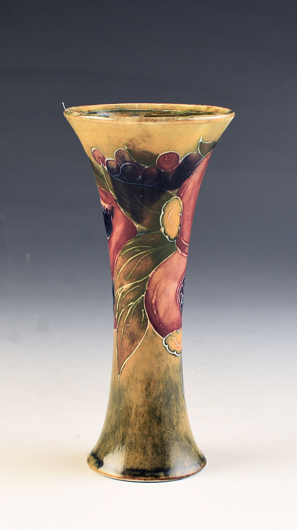 A very rare shape and size pomegranate vase on an ochre ground that dates to 1914. I cannot remember the last time i saw this shape and size! Nicely decorated with really good colouring. GUARANTEED to be free from damage and restoration, signed to the base and measures 13cm in height.